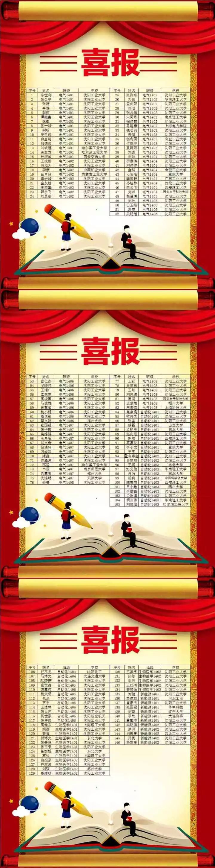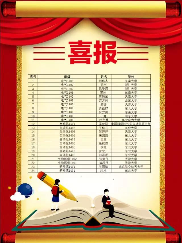 暑期将至,又到了每年备考复习的关键时期。我们14级的考研录取成绩单也已新鲜出炉。今年太阳成集团tyc33455共有24名学子获得保研资格,其中浙江大学2名、天津大学5名、中国科学院沈阳自动化研究所1名、华北电力大学1名、北京航空航天1名、山东大学2名、东南大学3名、东北大学9名。146名学子考上心仪的学校,其中不乏西安交通大学、西安电子科技大学、哈尔滨工业大学、重庆大学、华中科技大学等中国知名大学。