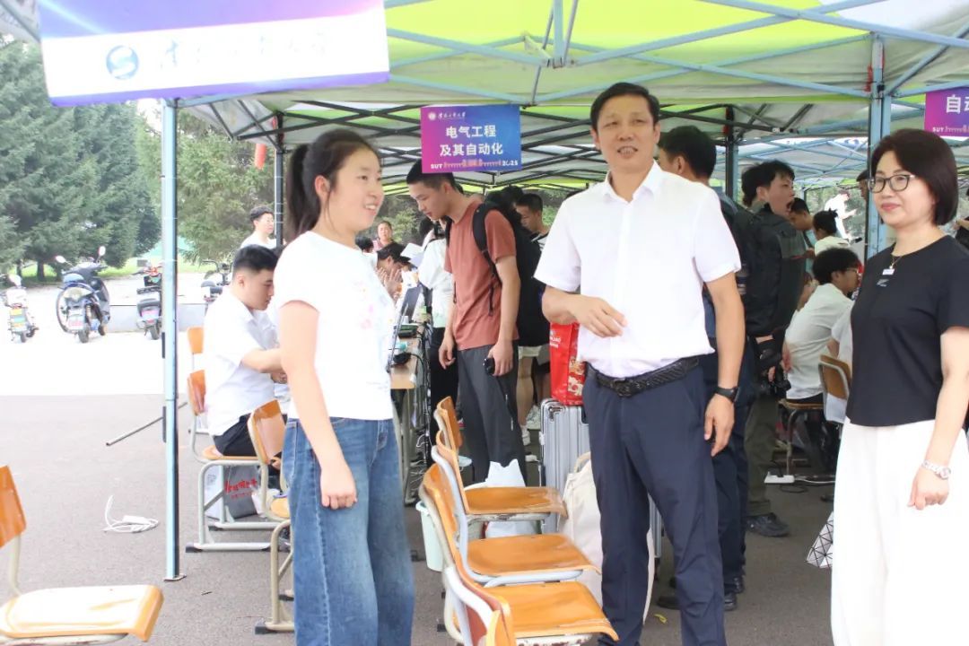 校领导走进迎新现场,目光满是关切。与新生唠家常,问问家乡、聊聊对校园的初印象;和志愿者们交流,叮嘱把服务做细做实;为新生准备爱心大礼包。